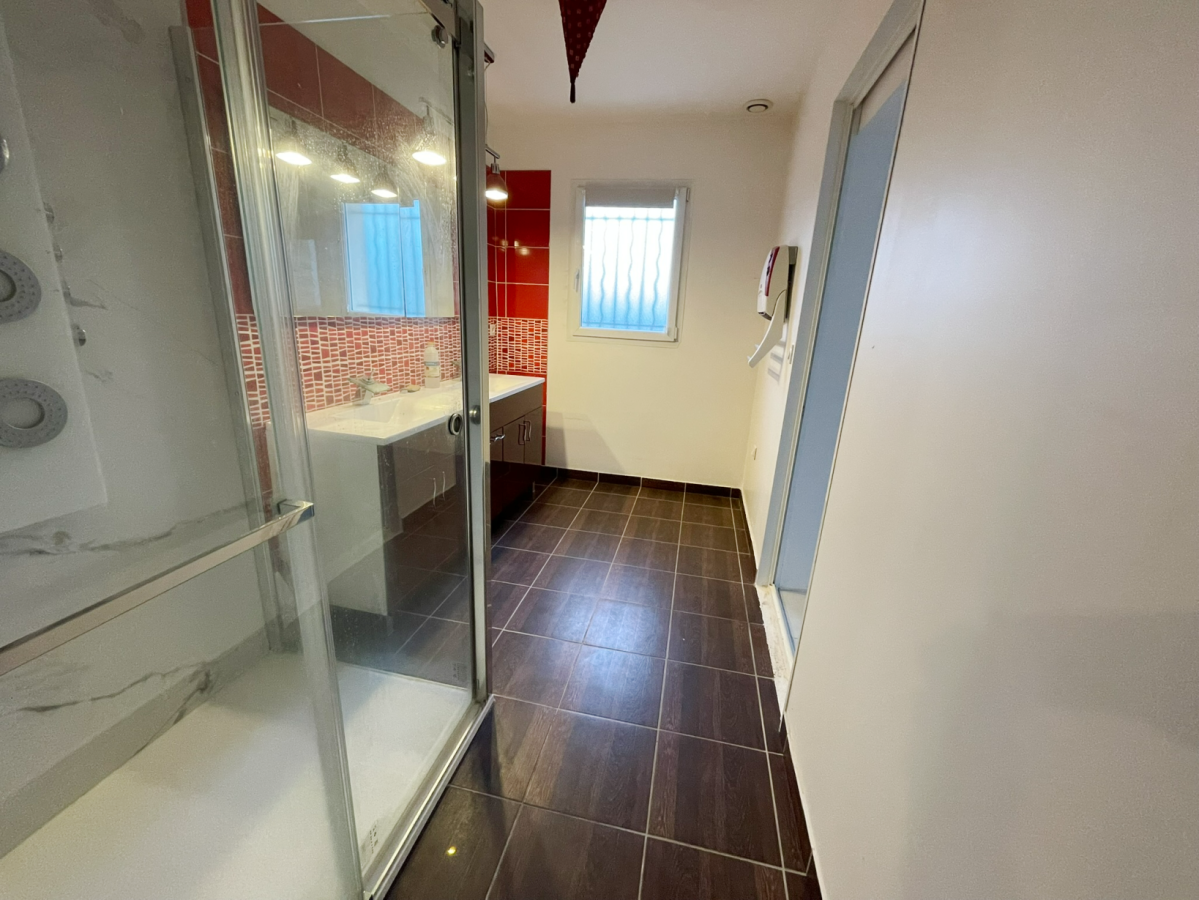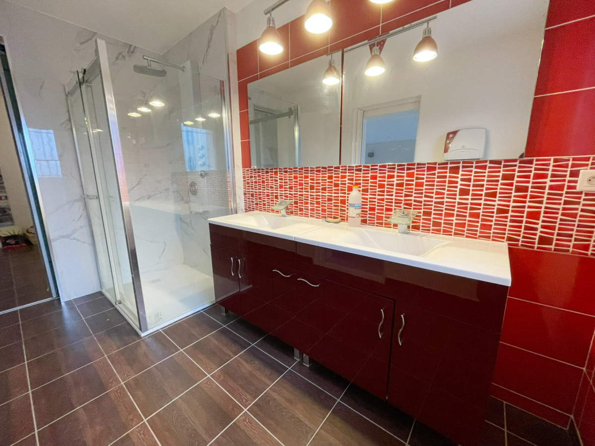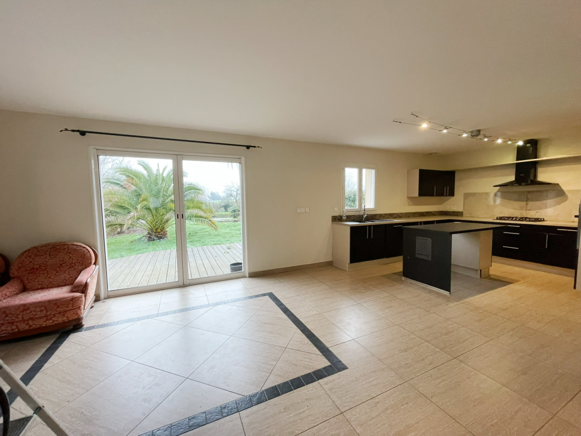 Maison offrant 5 CHAMBRES + 1 AUTRE GRANDE PIECE sur un terrain de 1600m². RDC : hall d’entrée (avec placard sous escalier) dans très bel espace de vie de 43m² env. comprenant salon salle à manger (avec conduit cheminée) et cuisine américaine aménagée et équipée, dégagement, 1 chambre (avec espace dressing) et salle d’eau attenante avec douche et meuble 2 vasques, WC séparé.
